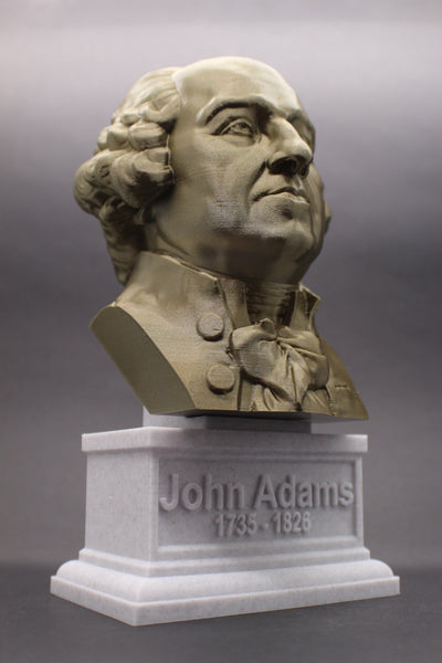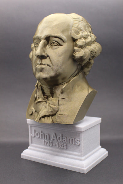 Bring the past to life with our 3D printed portrait bust of John Adams. Made from high-quality PLA, this realistic bust interprets the essence of the former president. The accompanying box plinth displays Adams' name and lifetime on the front and his dates in office on the back. Choose from 5 different base colors for the bust and plinth to compliment your decor. Celebrate history in style with this one-of-a-kind piece.
