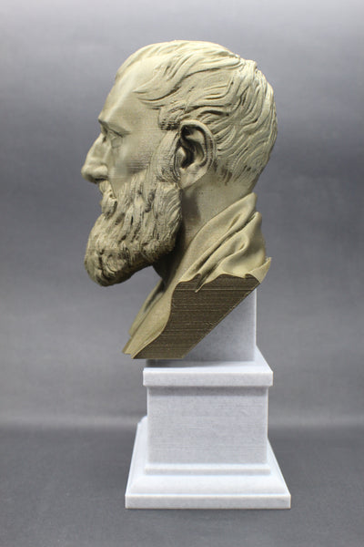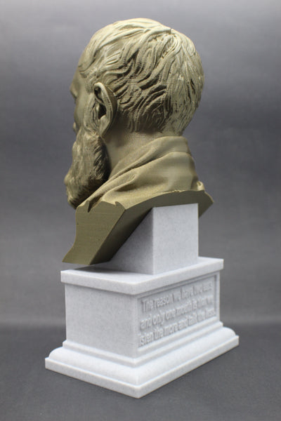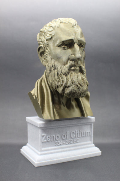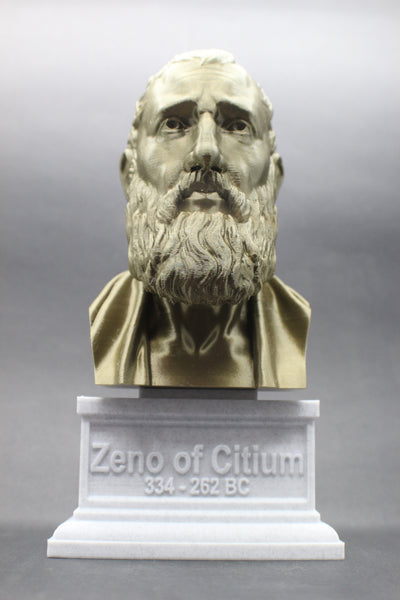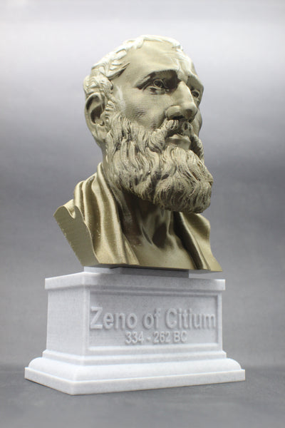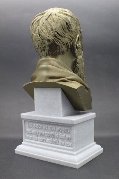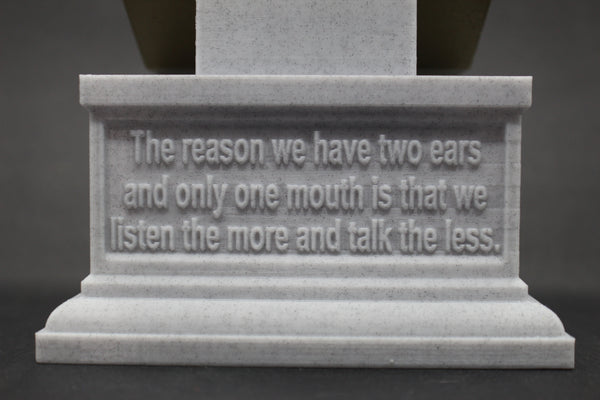 Pay homage to the wisdom of Zeno with this realistic 3D printed portrait bust. Expertly crafted in PLA, the bust sits atop a beautifully designed box plinth that displays the name and lifetime of the ancient Greek philosopher on the front. The back features one of his famous quotes, "The reason we have two ears and only one mouth is that we listen the more and talk the less", reminding us of the importance of reflection and mindful listening. Choose from 5 different base colors to personalize the look of your bust and bring a touch of ancient philosophy into your home or office. This unique piece is sure to inspire and impress any lover of classical wisdom.