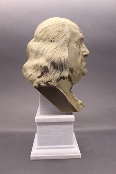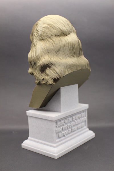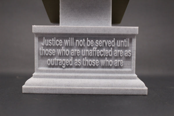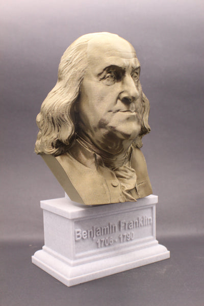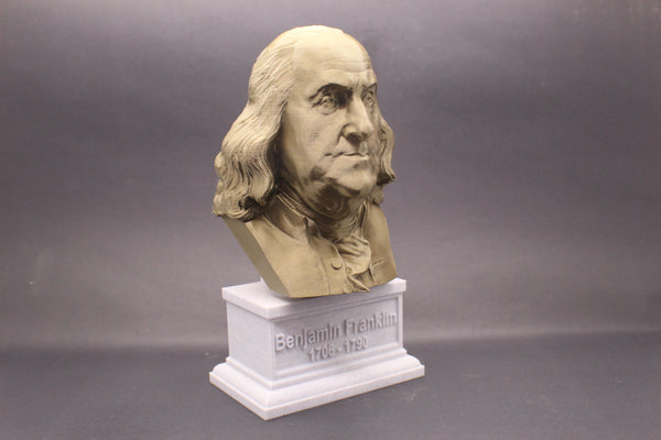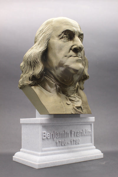 Honor one of America's founding fathers, Benjamin Franklin, with this impressive 3D printed portrait bust. Made with high-quality PLA material, this realistic bust interprets Franklin's distinctive features and adds a touch of historical elegance to your collection. The accompanying box plinth showcases his name and lifetime on the front and his thought-provoking quote, "justice will not be served until those who are unaffected are as outraged as those who are," on the back. Choose from 5 different base colors for both the bust and the box plinth to personalize this piece. Get yours today and add a piece of revolutionary history to your decor.