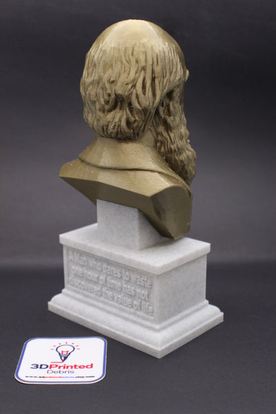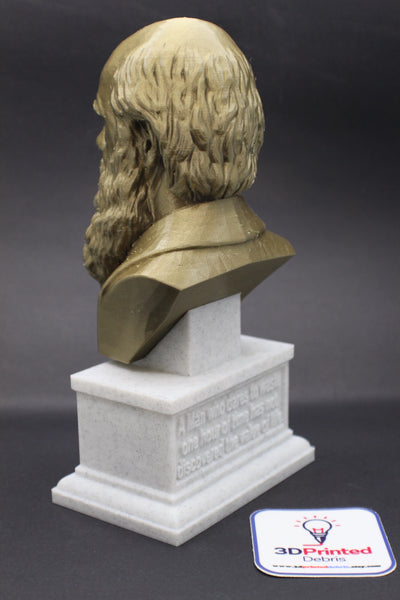 Honor the great mind of Charles Darwin with a realistic 3D printed portrait bust, crafted with care in PLA material. This bust captures the likeness of Darwin with stunning detail, perfect for any science or history enthusiast. The accompanying box plinth features Darwin's name and lifetime on the front and a thought-provoking quote "a man who dares to waste one hour of time has not discovered the value of life" on the back. Choose from 5 different base color options to match your personal style and display this piece with pride.