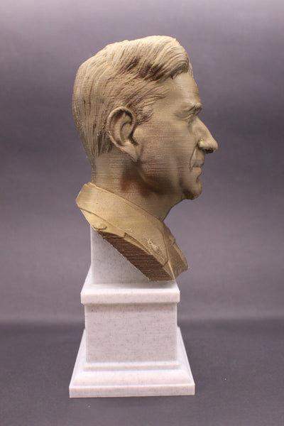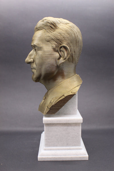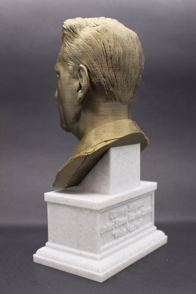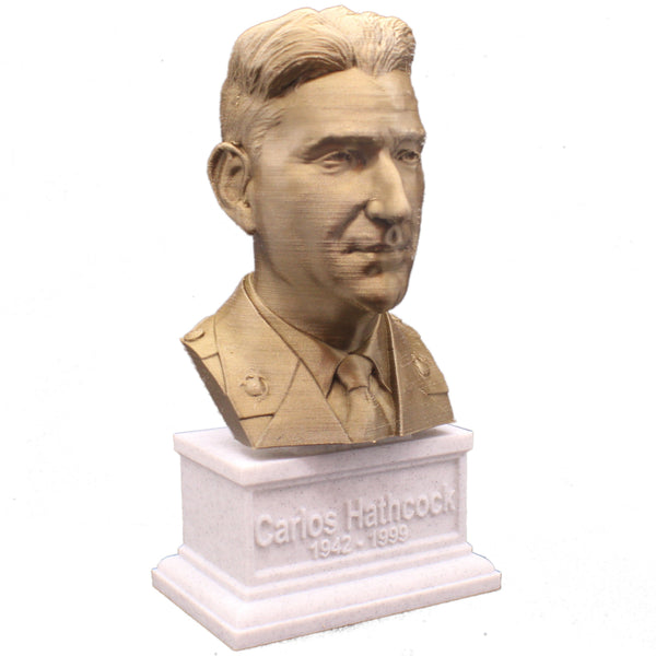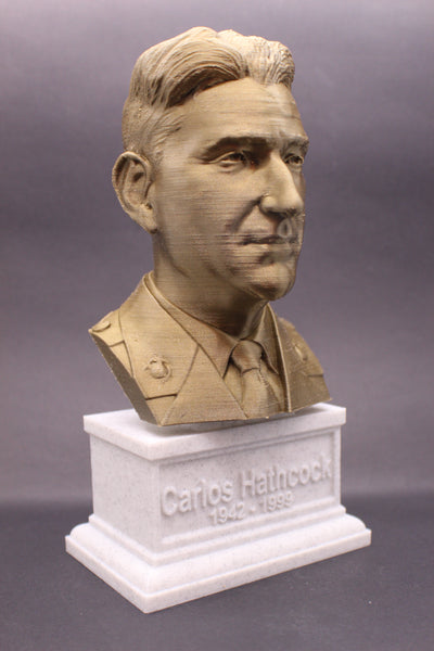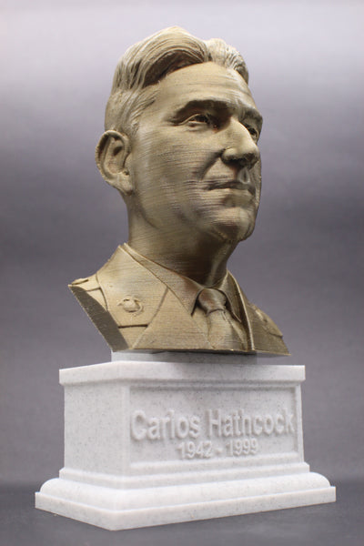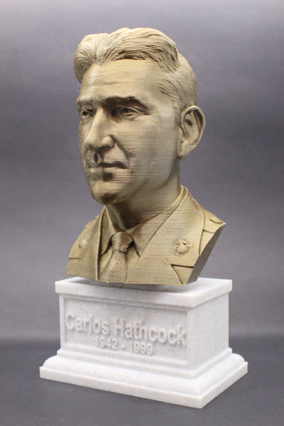 Our 3D printed portrait bust of Carlos Hathcock in PLA is a stunning, realistic interpretation of this legendary gunnery sergeant in the United States Marine Corps. The box plinth displays Hathcock's name and lifetime on the front and honors his military distinction on the back with the text "Gunnery Sergeant," "United States Marine Corps," and his famous moniker "White Feather." Choose from 5 different base colors to customize your bust and box plinth to compliment your decor.