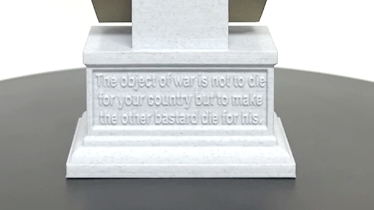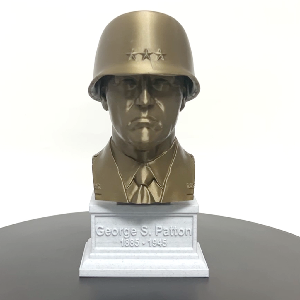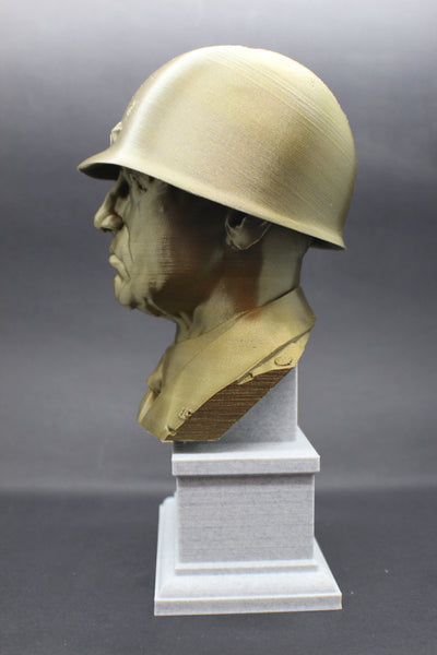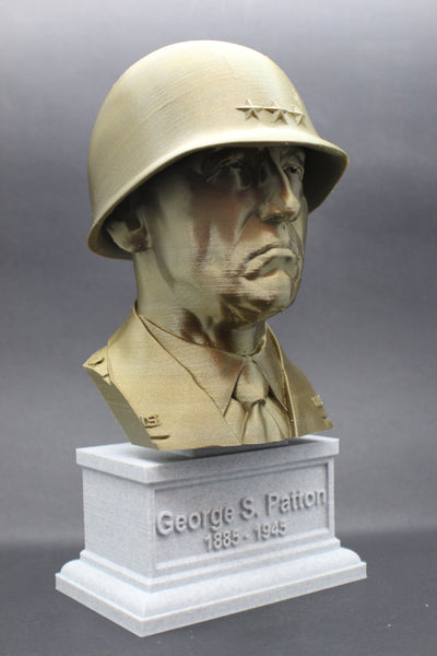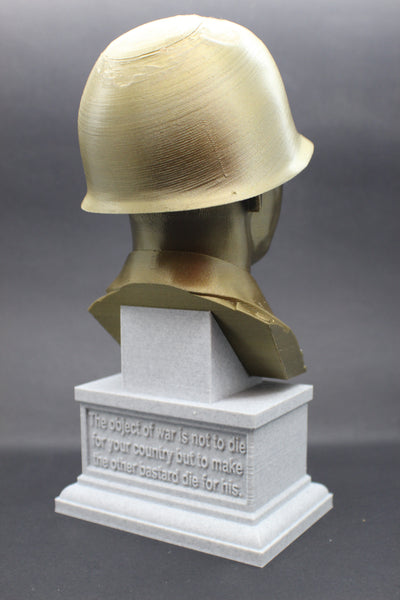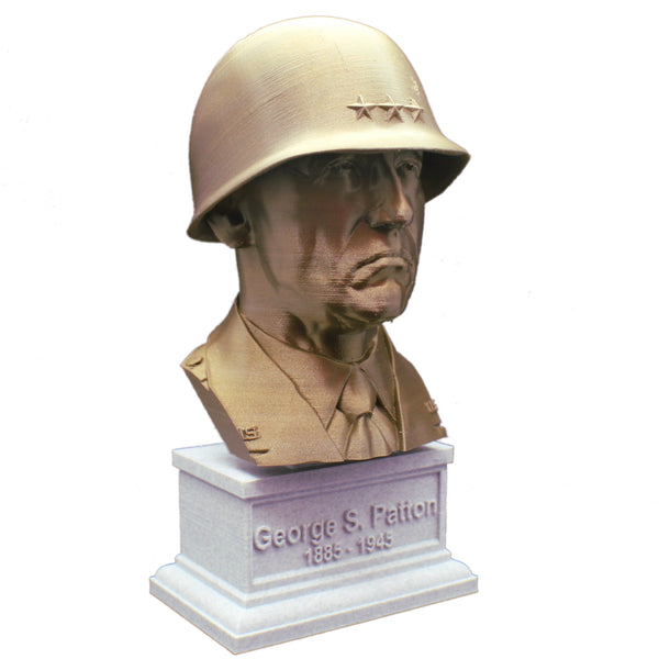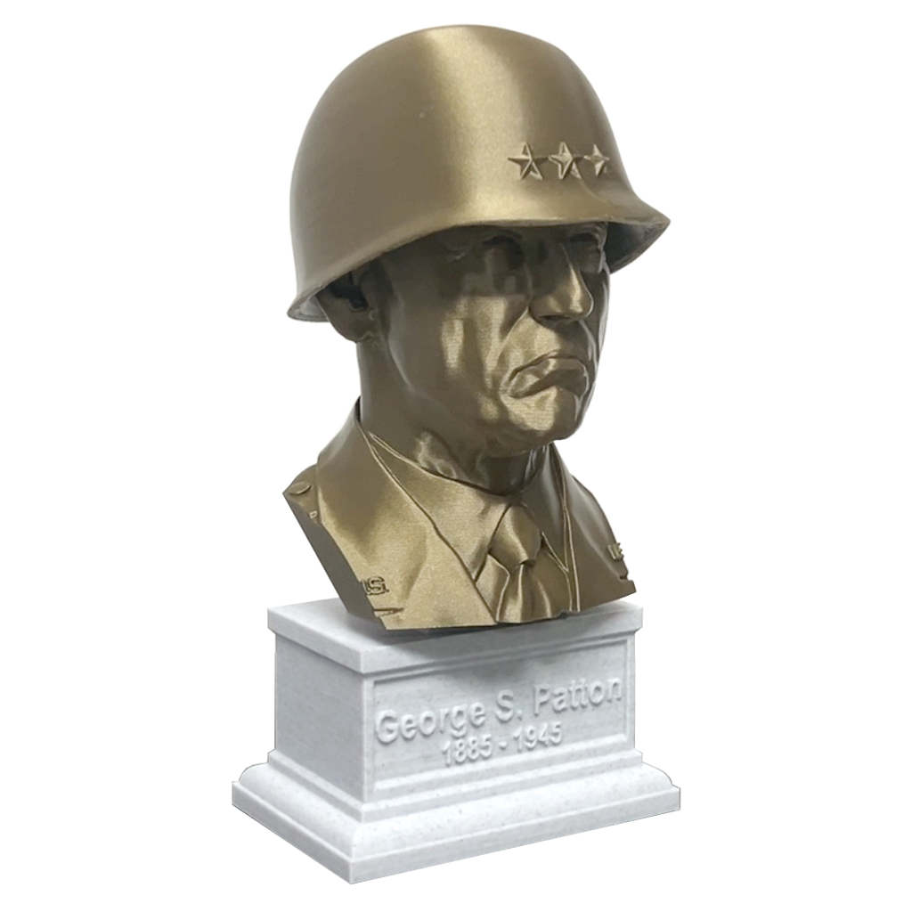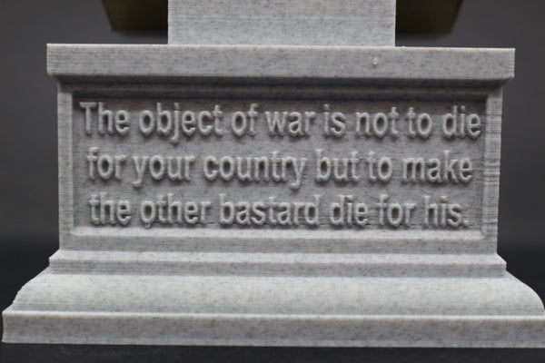 Enhance your collection with a realistic 3D printed portrait bust of George S. Patton, made with durable PLA material. The accompanying box plinth showcases his name and lifetime on the front, with the memorable quote "the object of war is not to die for your country but to make the other bastard die for his" on the back. With 5 different base color options for both the bust and the box plinth, you can customize this piece to perfectly fit your decor.
