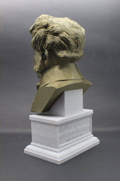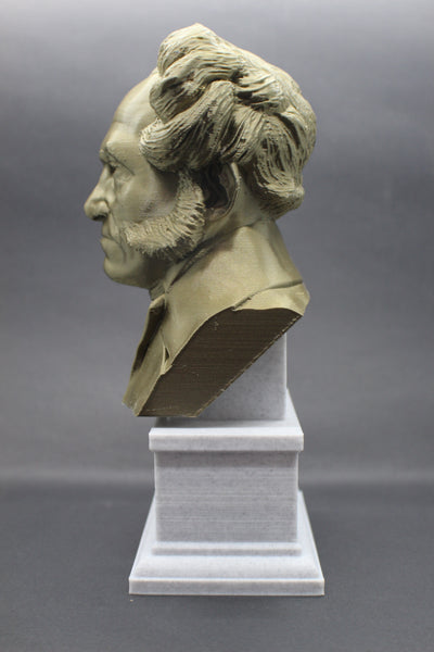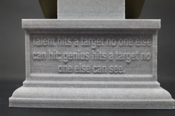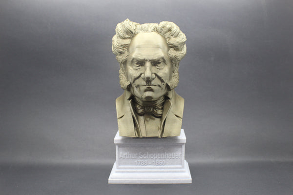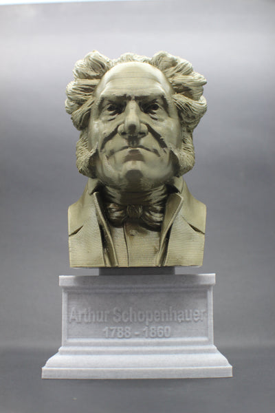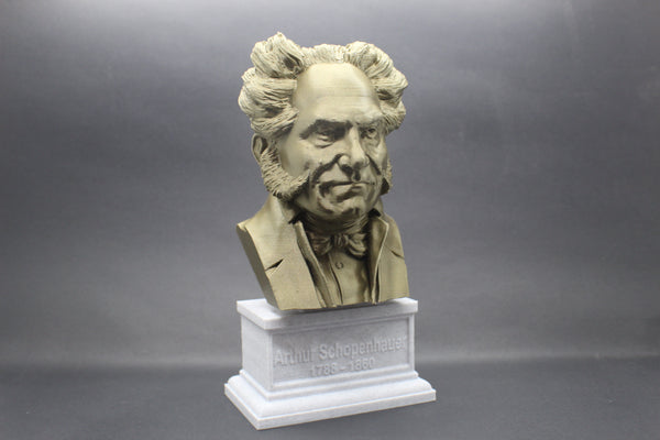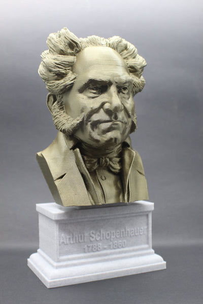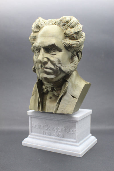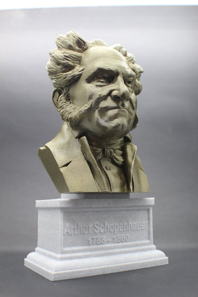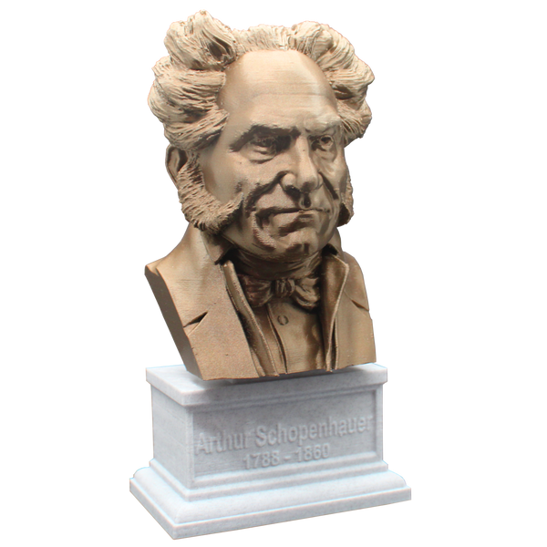 Honor the philosophy of Arthur Schopenhauer with this beautiful 3D printed portrait bust. Made with high-quality PLA material, this realistic bust interprets the famous philosopher's striking features and adds a touch of elegance to your collection. The accompanying box plinth showcases Schopenhauer's name and lifetime on the front and his insightful quote, "talent hits a target no one else can hit; genius hits a target no one else can see," on the back. Choose from 5 different base colors for both the bust and the box plinth to personalize this piece. Get yours today and add a piece of brilliant thought to your decor.