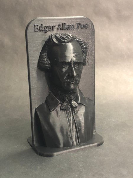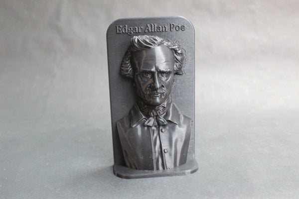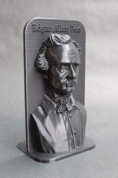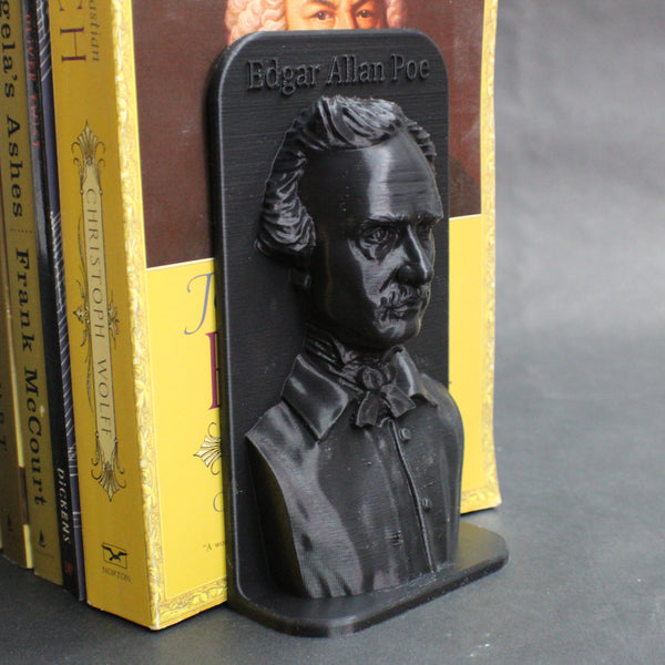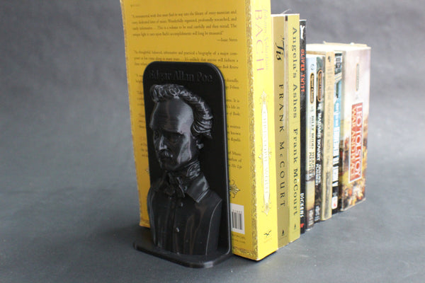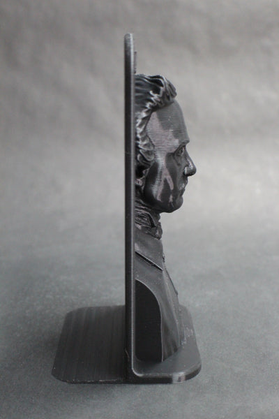 Here is a custom book end I designed to keep my books tidy and add a cool touch of an author's portrait in 3D on the face. It is very strong yet light, and the foot of the bookend is tapered so that it slides easily beneath the first couple of books for their weight. Once in place it is extremely sturdy, and will keep your books in place.