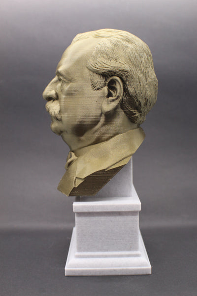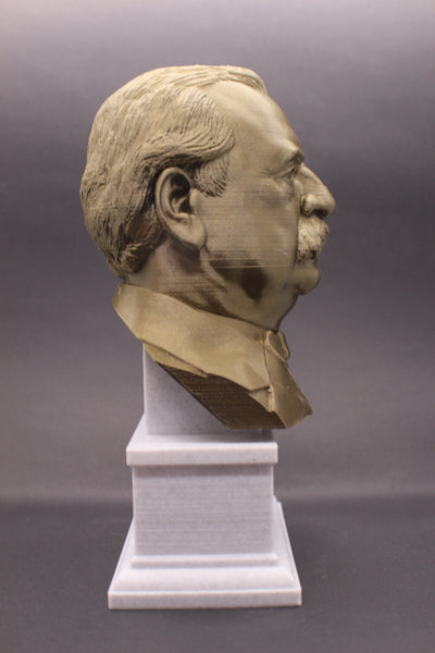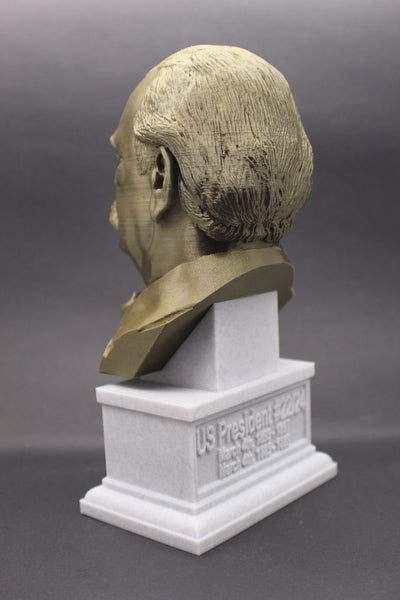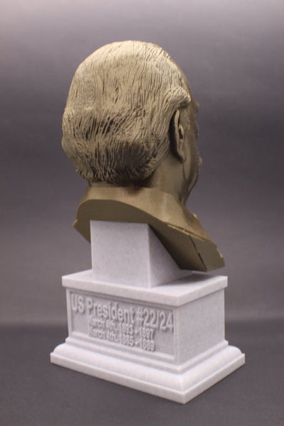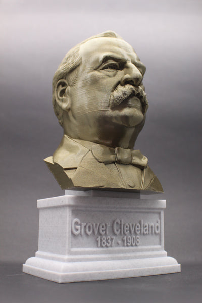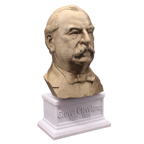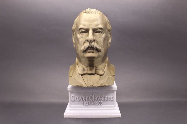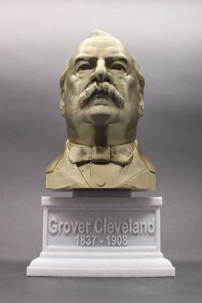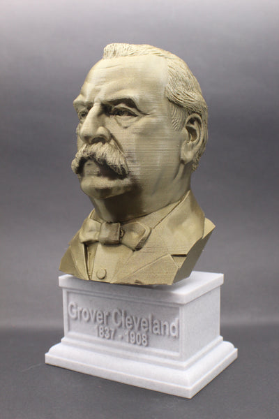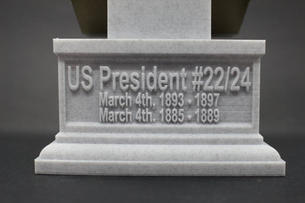 Realistic 3D printed portrait bust of Grover Cleveland in durable PLA material, perfect for history buffs and collectors. The box plinth displays the name and lifetime of the former President on the front and his dates in office on the back. Showcase your appreciation for American history with this beautiful bust, available in 5 different base colors for the bust and the box plinth. Make a statement in your home or office with this unique and educational piece.