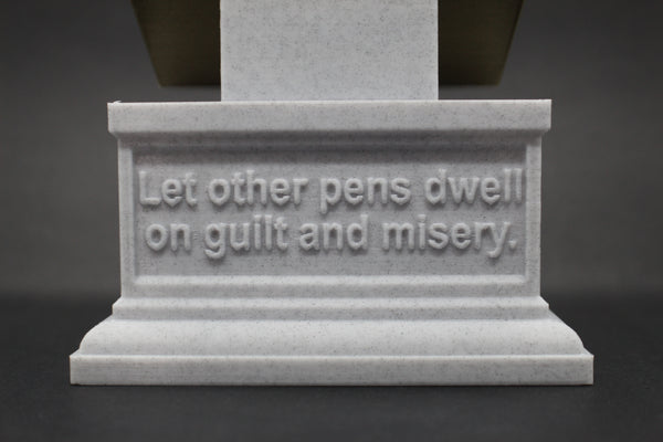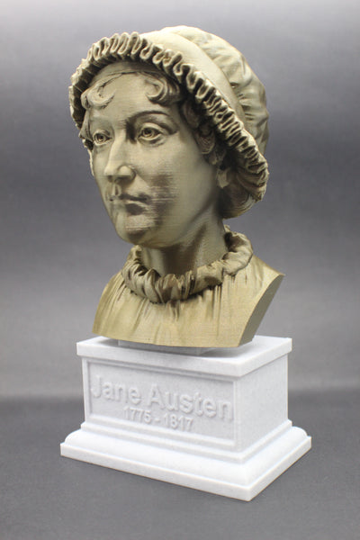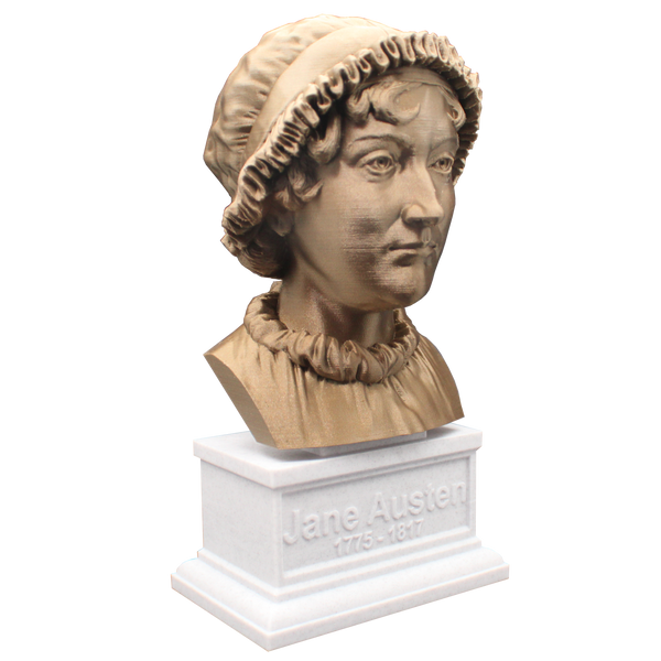 Celebrate the timeless works of Jane Austen with our stunning 3D printed portrait bust. Expertly crafted from high-quality PLA, this bust interprets the likeness of the beloved author in lifelike detail. The accompanying box plinth displays her name and lifetime on the front, while showcasing the inspiring quote "Let other pens dwell on guilt and misery." on the back. With 5 base color options to choose from, you can customize the bust to suit your personal style. Perfect for literature enthusiasts and fans of classic literature, this portrait bust is a must-have addition to any collection. Order yours today!