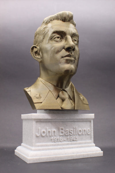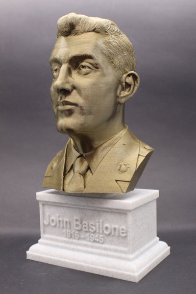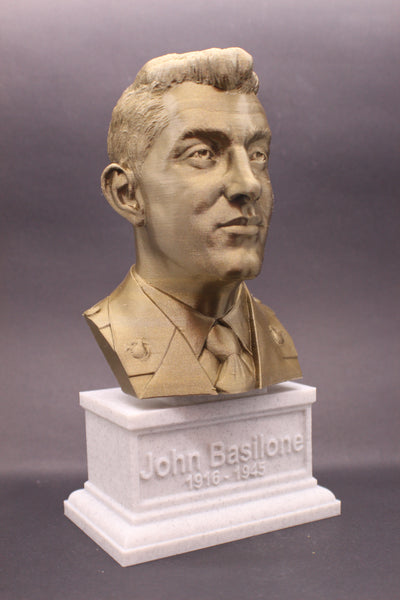 Introducing our 3D printed portrait bust of John Basilone in durable PLA material. The bust is meticulously crafted to capture the realism of this legendary Marine. The box plinth displays his name and lifetime on the front and proudly displays his titles and honors on the back: Gunnery Sergeant, United States Marine Corps, Medal of Honor. Choose from 5 different base colors to complement the bust and the box plinth.