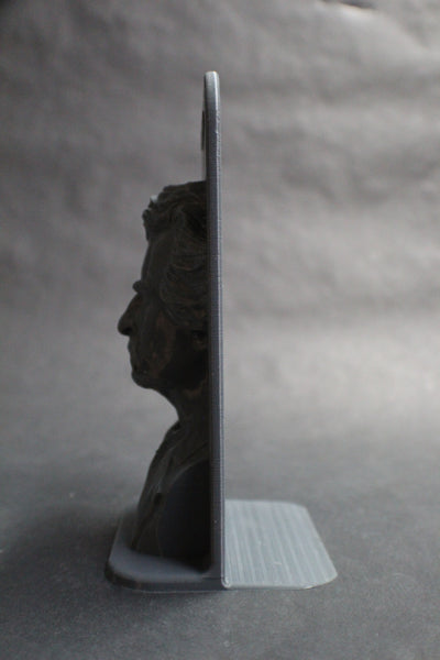 Here is a custom book end I designed to keep my books tidy and add a cool touch of an author's portrait in 3D on the face. It is very strong yet light, and the foot of the bookend is tapered so that it slides easily beneath the first couple of books for their weight. Once in place it is extremely sturdy, and will keep your books in place.