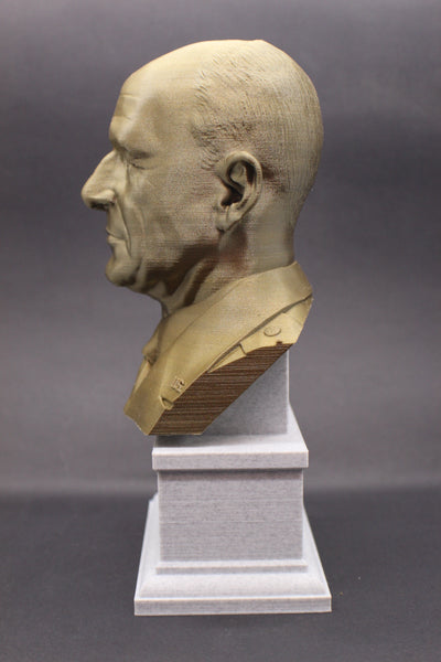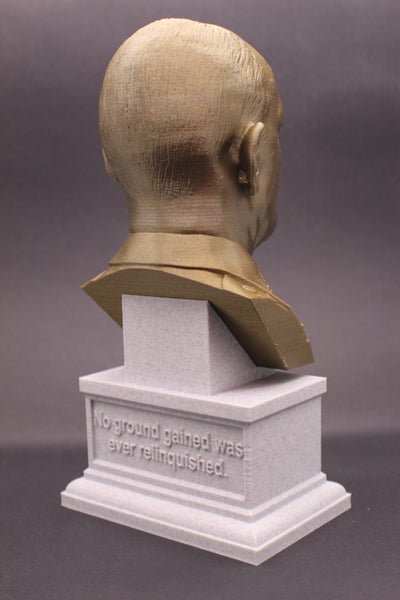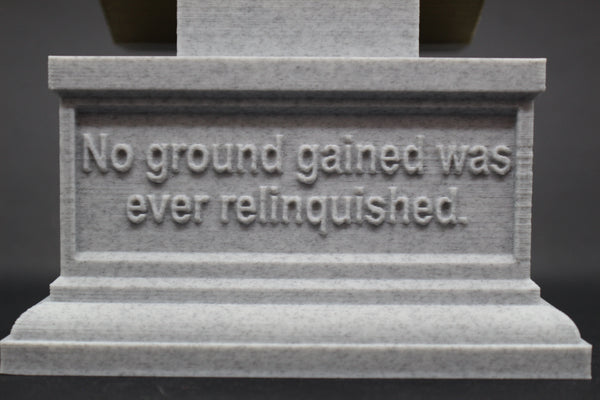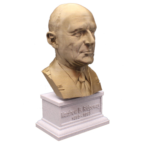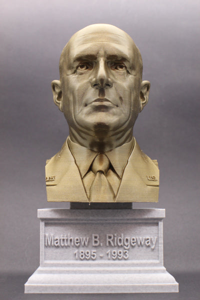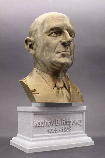 Introducing the Realistic 3D Printed Portrait Bust of Matthew B Ridgeway in PLA. Honor the legacy of this legendary figure with this stunning piece. The bust is expertly crafted and depicts the likeness of Ridgeway in great detail. The accompanying box plinth displays his name and lifetime on the front, while the back showcases his famous quote "No ground gained was ever relinquished." Choose from 5 different base colors to suit your taste and complement the bust. Order now and bring a touch of history into your home or office.